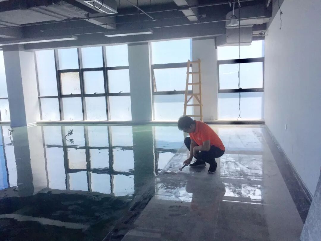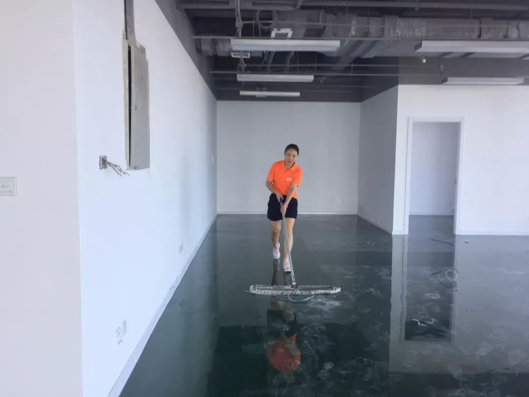 由于現場(chǎng)沒(méi)有電無(wú)法使用大功率吸塵裝備吸附粉塵,保潔人員用拖把一遍遍的把地面清理干凈。